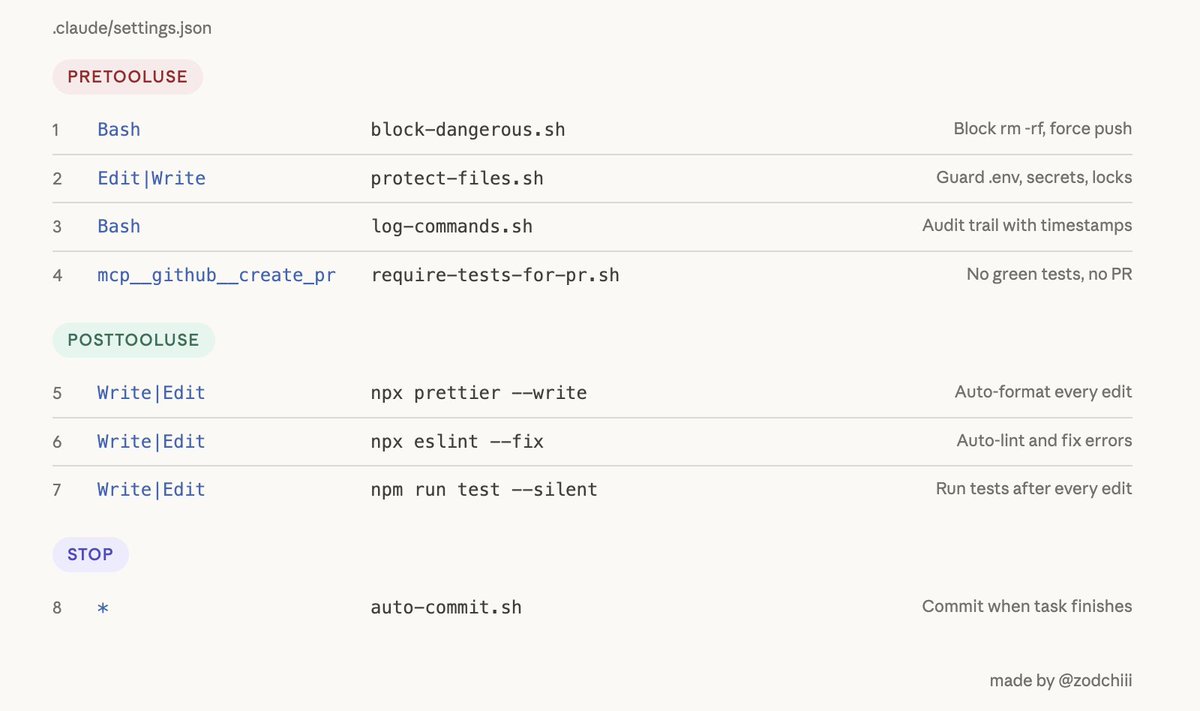 The hook: Run your test suite automatically after every code change. If tests fail, Claude sees the failure and can fix it immediately.